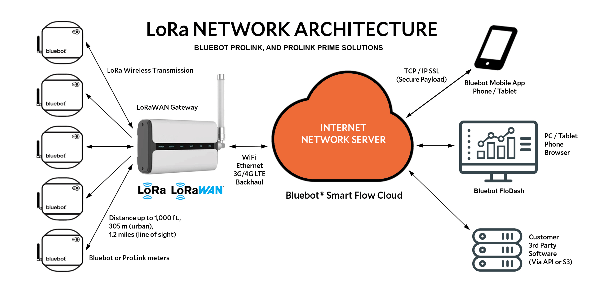 Capture your water data from nearly anywhere. No Wi-Fi signal is required at the device install location. The LoRaWAN enabled Bluebot EcoLink and ProLink smart flow meters transmit data over long distances in a cost-effective and efficient manner. By using a special modulation procedure (Chirp Spread Spectrum), very long ranges and excellent building penetration can be achieved.